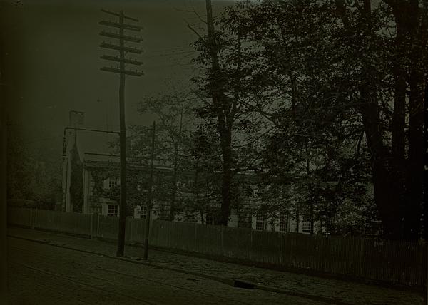 Exterior view of house from the steps of the Methodist Church, looking south. Earliest section built circa 1690 by Hans Milan. Center section and alterations were designed and completed by William Strickland in 1824. For nine generations belonged to the Wistar-Haines family.