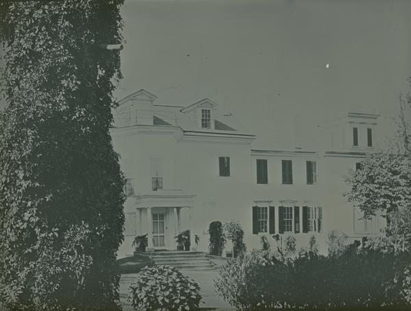 Exterior view of the north front of the Carlton Mansion, taken from the east. Purportedly named after an English castle inhabited by Queen Elizabeth I. The original house was destroyed by the British in 1777 but rebuilt in 1780 by Isaac Tustin. Served as Washington's Headquarters for a few weeks before and after the Battle of Brandywine. Purchased by Cornelius S. Smith in May of 1840 and later bequeathed to his children.