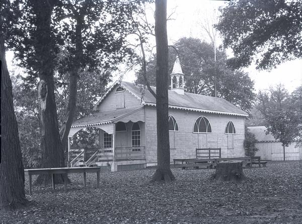 Exterior view of the clubhouse known as The Castle of the Fishing Company of the State in Schuylkill. Association formed in 1732 for hunting and fishing, originally on "Eaglesfield" the old estate of William Warner on the western bank of the Schuylkill River. Construction of the Fairmount Dam circa 1822 forced the clubhouse to rebuild their home near Gray's Ferry, across the river from Bartram's Garden on Rambo's Rock.