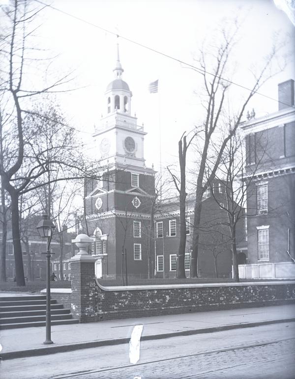Oblique view of the south elevation and bell tower of Independence Hall from Fifth Street, showing the stone wall that surrounds the square. Built 1732-1748 by Andrew Hamilton and Edmund Woolley. Extensive renovations and additions completed incrementally between 1750 and 1973. Meeting place of the Second Continental Congress from 1775-1783 and the site where the Declaration of Independence was signed on July 4, 1776.