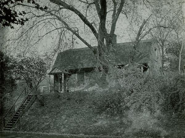 View of dwelling at the top of a hill in Fairmount Park, Located on the west side of the Schuylkill River above the Reading Railway Bridge. A steep set of stairs extends from the entrance of the stone farm house to the bottom of the hill in the foreground. The farm house was on the estate of Jacob S. Waln when the Irish poet Tom Moore puportedly stayed here during his visit to Philadelphia in 1804.