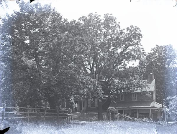 Exterior view of Mill Grove, partially hidden by trees in the foreground. Built in 1762, purchased by Captain Jean Audubon in 1789 and occupied in 1803 by his son John James Audubon. Audubon was an artist, author and naturalist and was best known for his bird preservation work and published bird drawings, "Birds of America". Samuel Wetherill acquired the property in 1813 to supply lead for his paint manufacturing company.