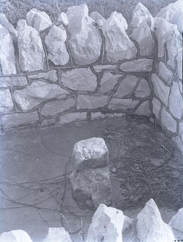 Depicts the Star Gazer's Stone enclosed by a stone wall. The quartzose stone was planted as a marker in 1764 by Mason and Dixon to determine the boundary line between Pennsylvania and Maryland. The stone was placed on the property of George Harlan.