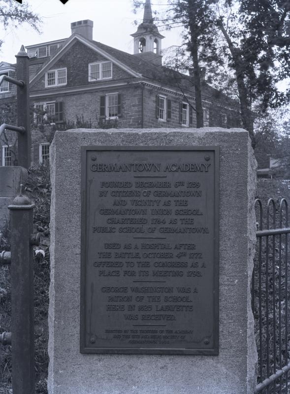 Depicts the plaque describing the history of Germantown Academy, erected by the Trustees of the Academy and the Site and Relic Society of Germantown in 1918. Germantown Academy is visible in the background. Built in 1760 by Jacob Knor on land purchased from John and George Bringhurst. Known as the Union School House when it opened in 1761. Instruction was in both English and German. The building was used as a hospital after the Battle of Germantown in 1777 and again in 1798 during the Yellow Fever epidemic.