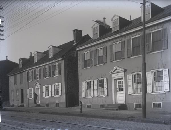 Depicts the west fronts of neighboring dwellings along Germantown Avenue, 4821 in the foreground and 4825 in the background, the latter built circa 1781 by Christopher Ottinger, a Revolutionary soldier who became a master coach maker after the war. A man stands on the steps of the Ottinger House.
