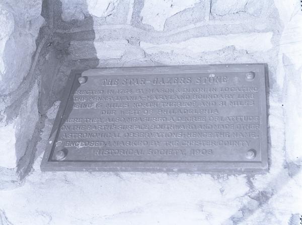 Depicts the plaque attached to the stone wall enclosing the Star Gazer's Stone, describing the history of the quartzose stone. It was planted as a marker in 1764 by Mason and Dixon to determine the boundary line between Pennsylvania and Maryland. The stone was placed on the property of George Harlan.