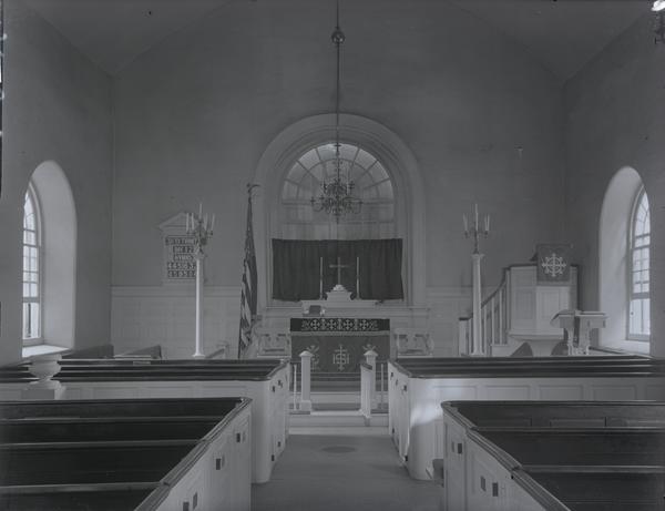 Interior view of chancel, altar and pulpit of St. David's Church, taken from the center aisle. An episcopal Welsh speaking congregation built the church from 1715 to 1717.