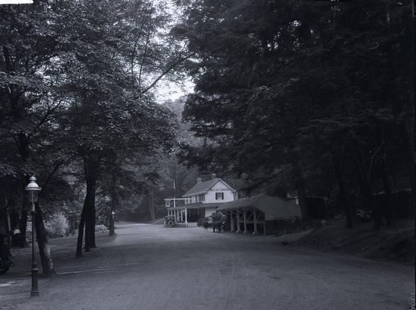 View showing the inn built by Thomas Livezey circa 1850 near the Wissahickon Creek. The inn, managed by several proprietors under the Livezey family, was purchased by the city in 1872 and given over to the supervision of a patriotic women's society circa 1900. Shows signage adorning the building advertising a tea room. Lettering spelling "Valley Green" is visible on the side of the inn. Also shows a stone fence and two horses stopped near a stable adjacent to the building. A car is parked in front of the inn.