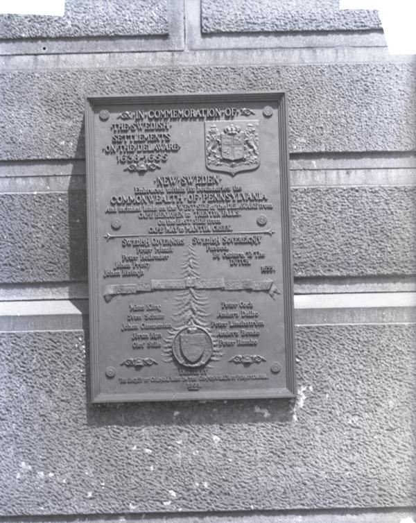 Depicts a commemorative plaque in City Hall, dedicated to Swedish settlements along the Delaware River, 1638-1655. Erected in 1909 by The Society of Colonial Wars in the Commonwealth of Pennsylvania.