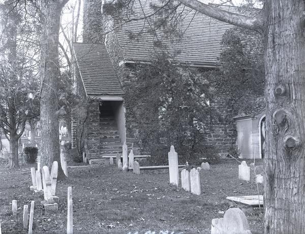 View of the cemetery of St. David's Church in Radnor and border of Wayne, Pa., showing the side of the stone church. An episcopal Welsh speaking congregation built the church from 1715 to 1717.