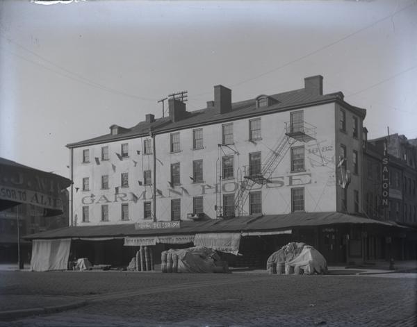 Depicts the Garman House at the northwest corner of Front and Dock Streets, originally the Blue Anchor Tavern. A large anchor projects from the building, near a painted anchor surrounded by the date 1682 on the brick building. Adjacent to a row of houses called Budd's Long Row, built after the tavern opened. A saloon occupies the lot north of the Garman House. Bushel baskets and barrels are piled outside of William Andrews fruit and produce business, located in the Garman House at the time of this photograph.