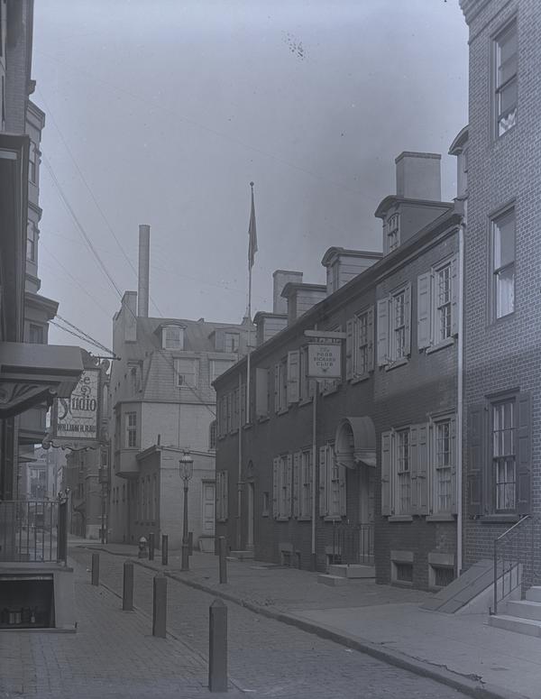 View of old dwellings, some occupied by the Poor Richard Club (239-241 South Camac Street) and William H. Rau's Studio, on Camac Street near Latimer. Depicts the narrow street lined with two story brick row houses looking north. Named after wealthy Irish landowner Turner Camac, who inherited properties on the street in 1804. Around 1880, the respectability of Camac Street declined when brothels and taverns moved in, bringing with them crime and debauchery. In the early 20th century, the Poor Richard Club moved to Camac Street, in an effort to revitalize the area. The old dwellings were transformed into clubhouses, studios and galleries.