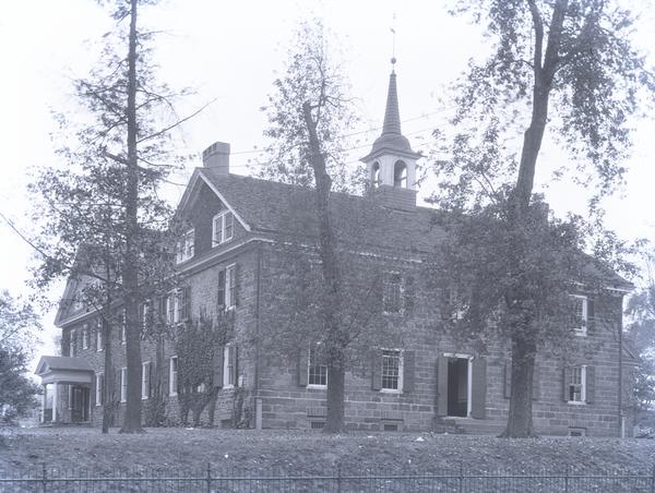 Exterior view of Germantown Academy, built in 1760 by Jacob Knor on land purchased from John and George Bringhurst. Known as the Union School House when it opened in 1761. Instruction was in both English and German. The building was used as a hospital after the Battle of Germantown in 1777 and again in 1798 during the Yellow Fever epidemic.