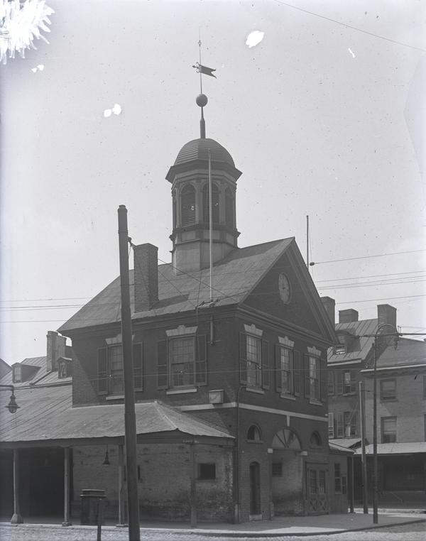 designed in 1745, with a cupola and alarm bell added in 1819. Two blocks of market sheds extend along Second Street from the