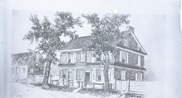 Copy of drawing depicting the west front and south side of Grumblethorpe, built in 1744 by Philadelphia wine merchant John Wister. His house was the first in Germantown built solely for summer residency and greatly exceeded the dimensions of the homes around it, giving it the nickname "Wister's Big House."