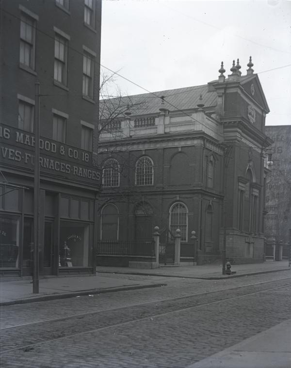 Oblique view of Christ Church looking northwest. Steeple not included in the image. The signboard and storefront of Mahood & Co. (16 North 2nd Street), is visible in the foreground. Church built 1727-1744 after designs by John Kearsley. Steeple built 1751-1754 after designs by John Harrison II and Robert Smith.