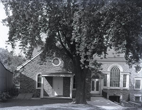 Exterior view of west front of stone church, showing roundel window above the entrance door, flanked by a shallow portico. Known as the Church of the Brethren, founded by Alexander Mack in 1708 near Crefeldt in North Prussia. Persecution drove the congregation to Philadelphia in 1719 and in 1723 the first Dunkard, or German Baptist Brethren Church, was organized in Germantown. The congregation originally worshipped in a building erected by Christopher Sauer (4653 Main Street) and then in a house secured by Peter Pettikoffer, who begged for the money to erect the building. Called Beggar's Town or Bettel Hausen.