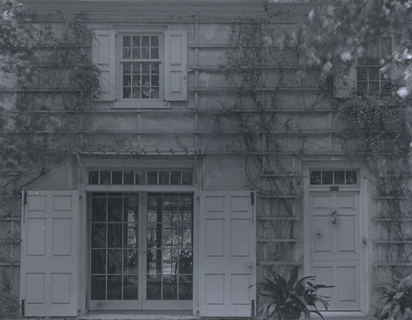Exterior detail of main front doorway and French doors. Earliest section of the house built circa 1690 by Hans Milan. Center