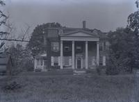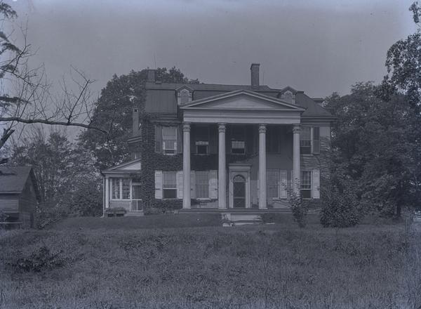 Distant view of porticoed front facade, with a partial view of an outbuilding. Original portion (i.e. east end) of house constructed in 1801 for Philadelphia merchant Thomas Armat by builders Peter L. Berry and John Ardis. Armat had the house built for his only son, Thomas Wright Armat. The west end was built in 1810 and the Greek portico in 1830. Named after Loudoun County, Virginia where Armat first settled in America.