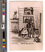 [African American woman on a balcony talking on a tin can telephone to an African American man minstrel] [graphic].