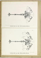 Series of trade catalog illustrations showing different styles of chandelier lamps produced by the chandelier works in Frankford. Includes views of three-, four-, and six-light chandliers with globe-, bell-, and fluted-shaped glass shades, Style numbers include no. 362, no. 363, no. 404, no. 457 and no. 661 (including "for Coal Oil"). Prints also includes the spread (from 19 to 36 in.) of the light fixtures., Three of the four prints contain plate numbers in upper right corner: Plate 59, 62, and 63., Cataloging funded by a grant from the National Endowment for the Humanities (PW-506-19-10), 2010-2012., Boell relocated his establishment to 312 & 314 Walnut Street in 1868.